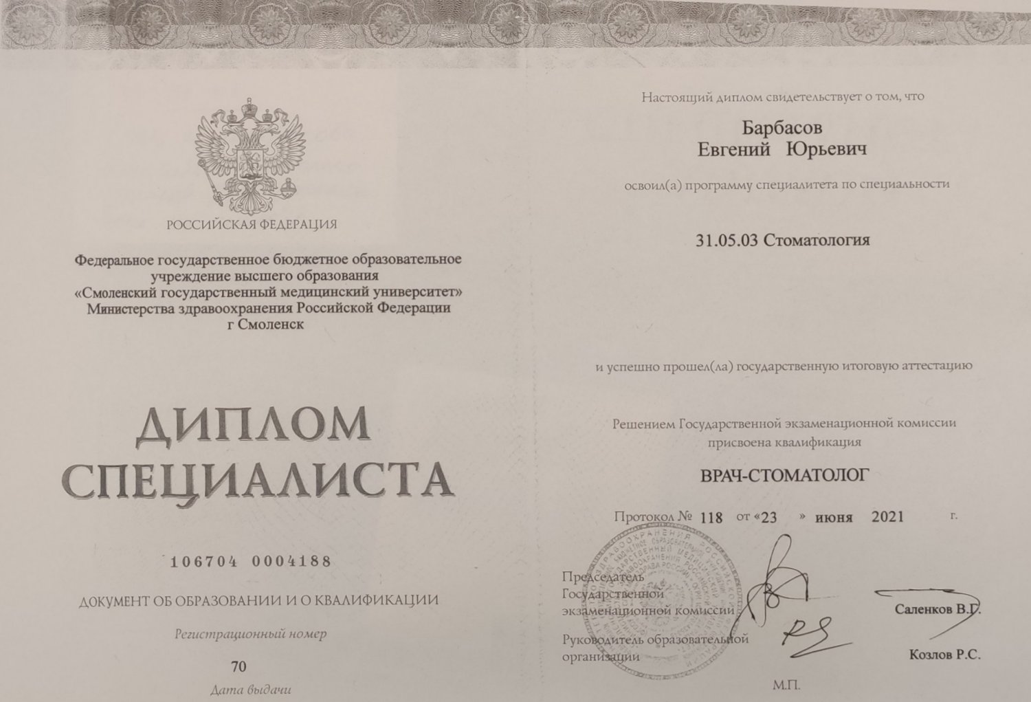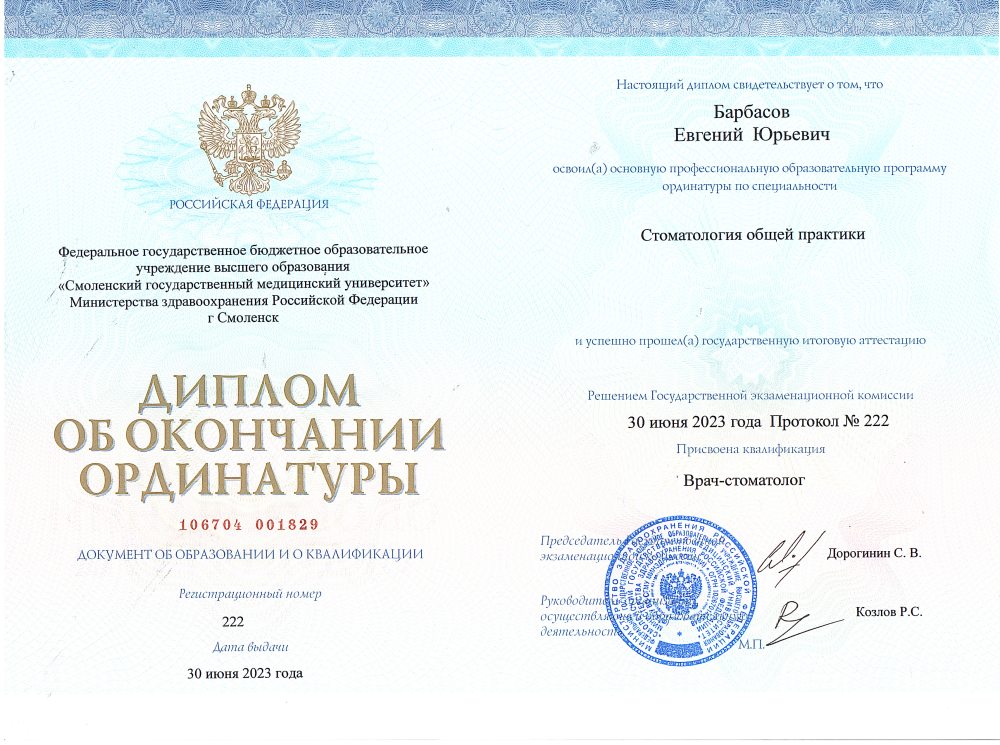 2023 Диплом специалиста по направлению Стоматология общей практики от 30.06.2023 № 106704/001829 Федеральное государственное бюджетное образовательное учреждение высшего образования «Смоленский государственный медицинский университет» Министерства здравоохранения Российской Федерации