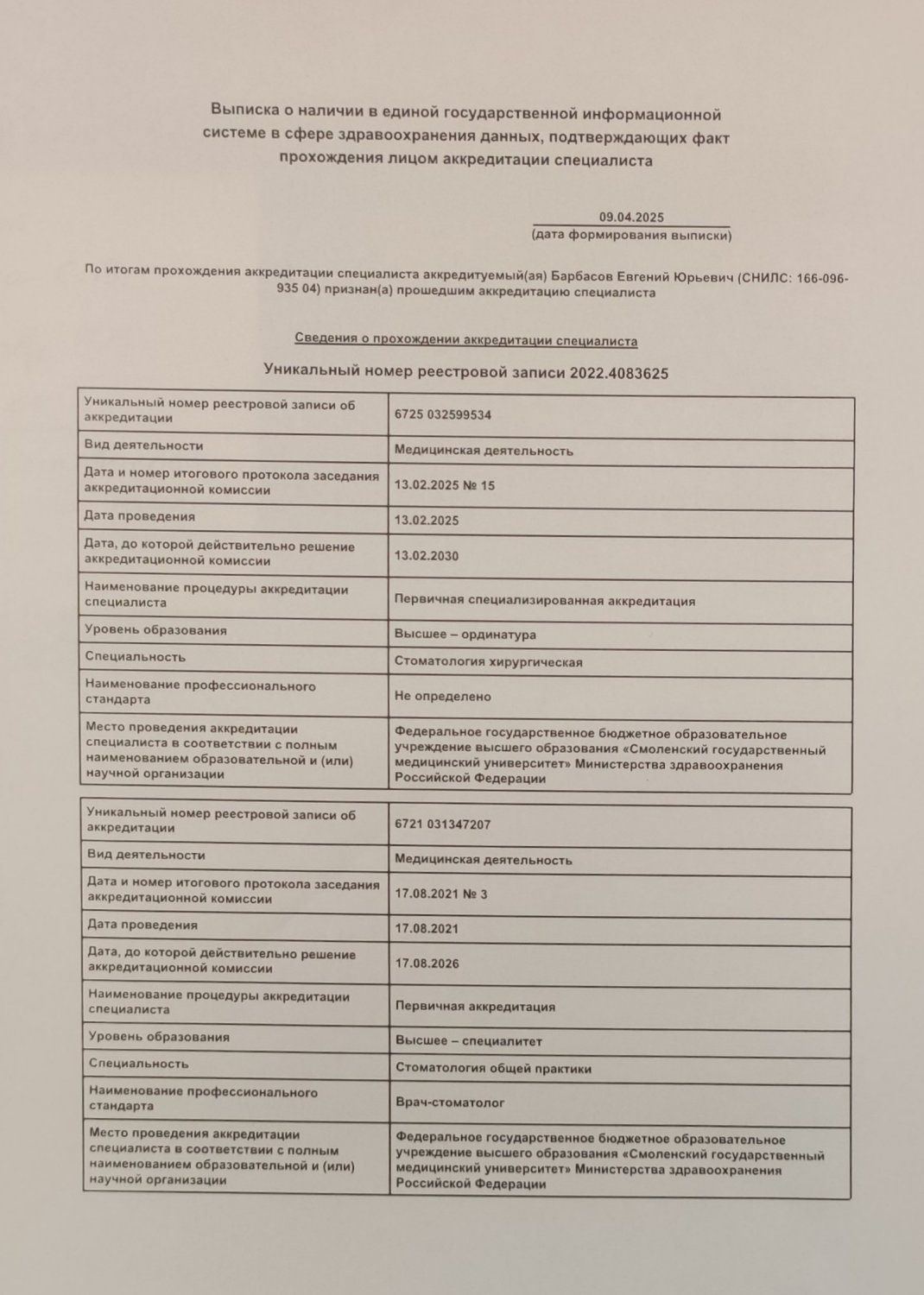 Первичная специализированная аккредитация по Стоматологии хирургической от 13.02.2025 до 13.02.2030