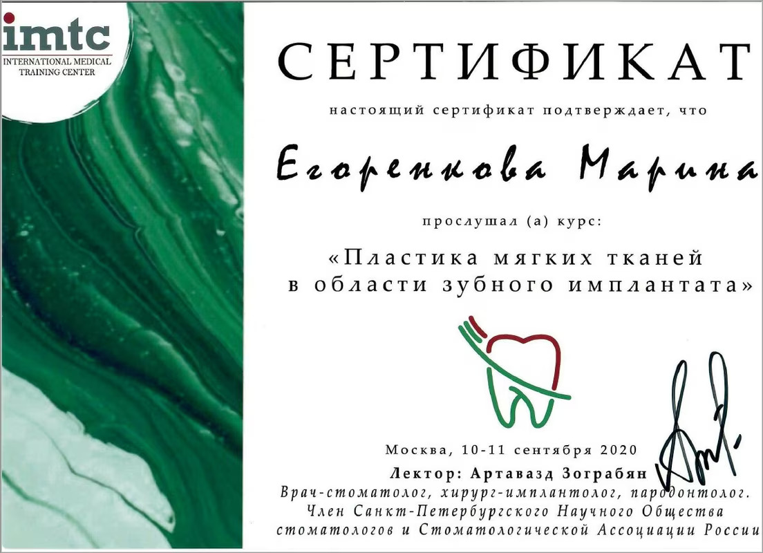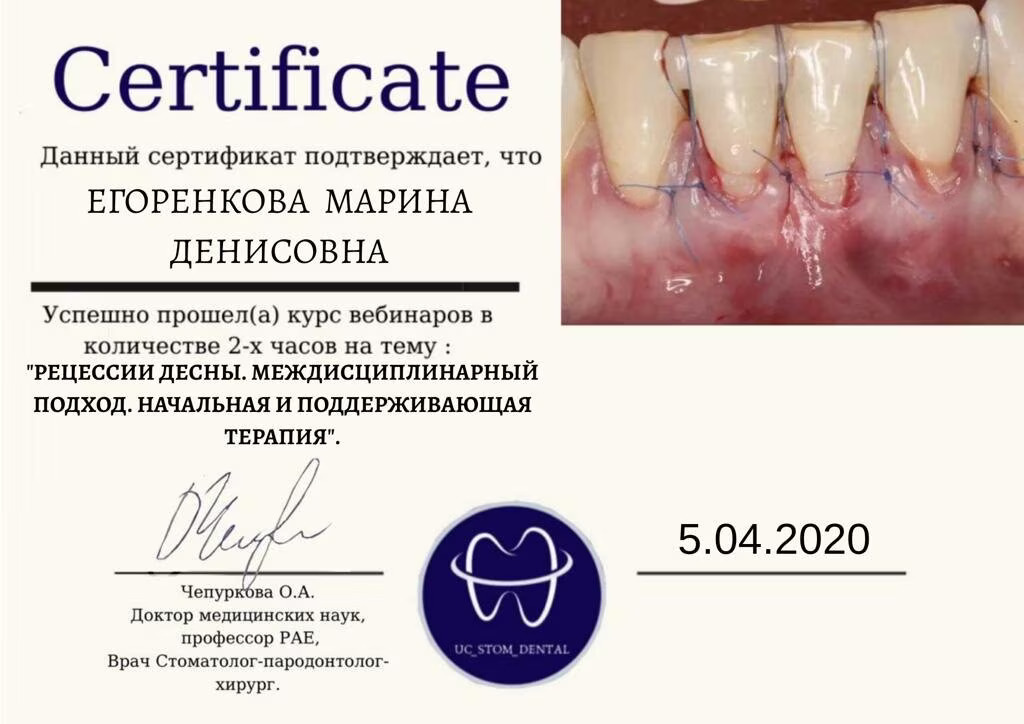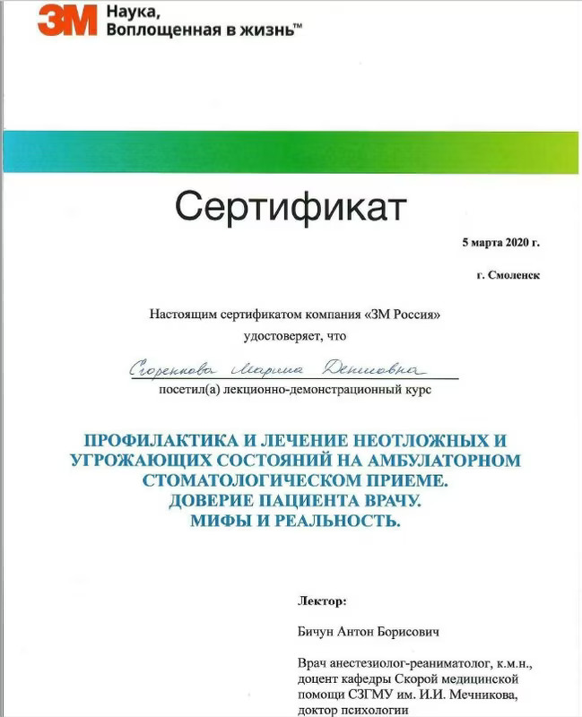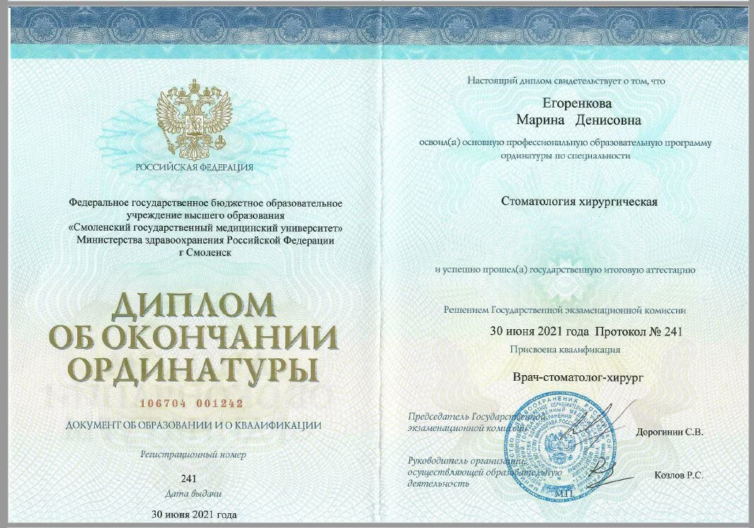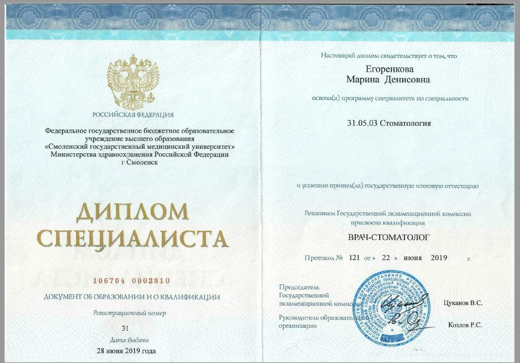 2019 Диплом специалиста по направлению « Стоматология» №106704/0002810 от 28.06.2019 Федеральное государственное бюджетное образовательное учреждение высшего образования «Смоленский государственный медицинский университет» Министерства здравоохранения Российской Федерации