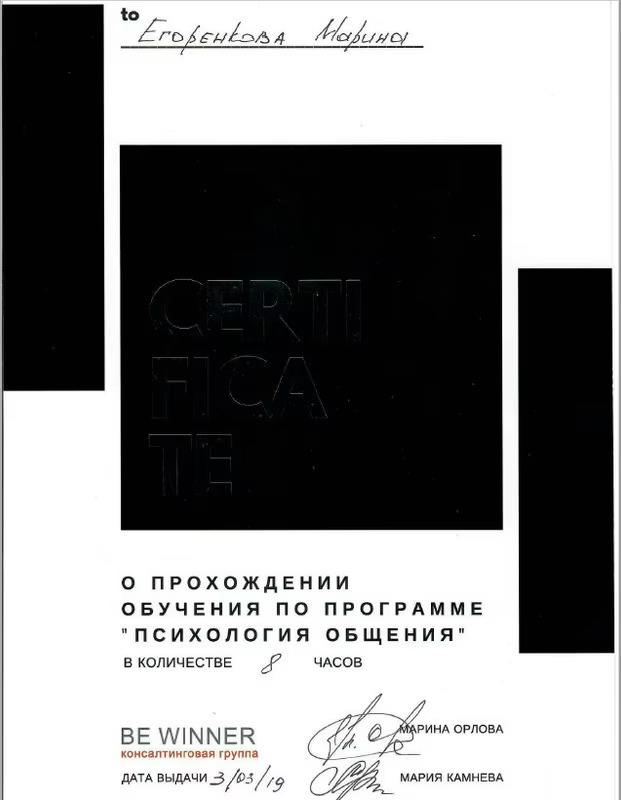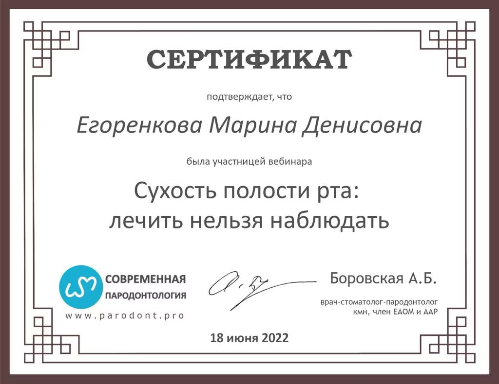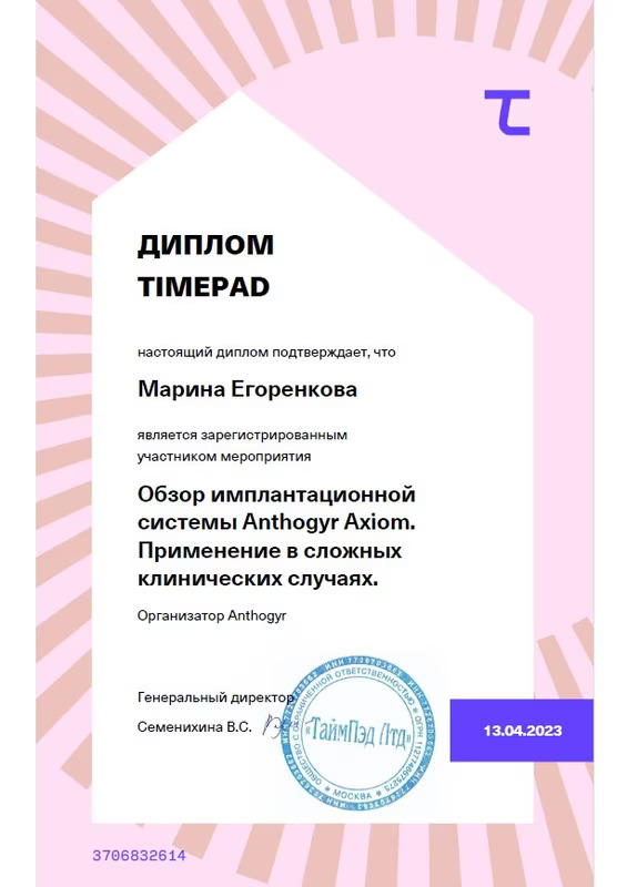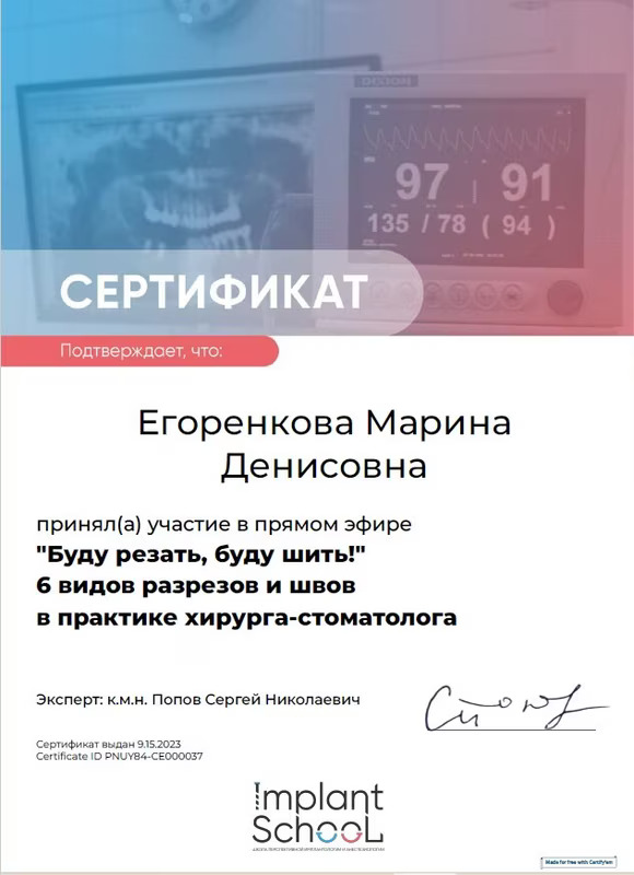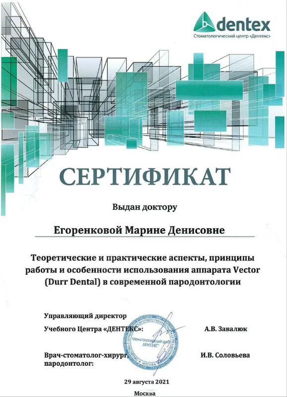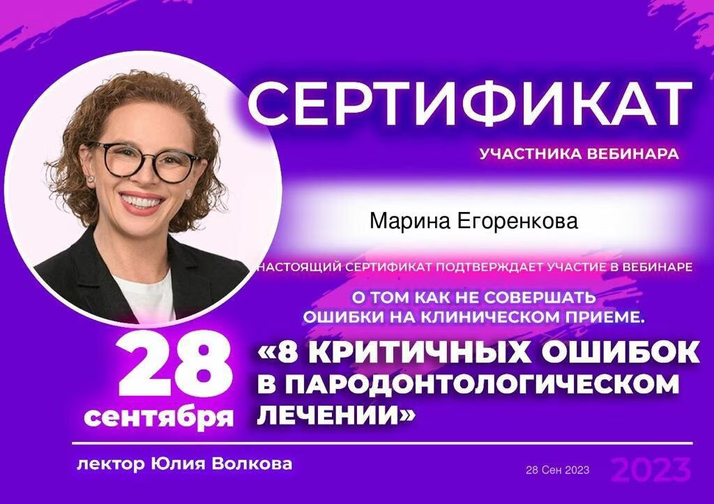 2019 Диплом специалиста по направлению « Стоматология» №106704/0002810 от 28.06.2019 Федеральное государственное бюджетное образовательное учреждение высшего образования «Смоленский государственный медицинский университет» Министерства здравоохранения Российской Федерации